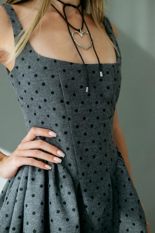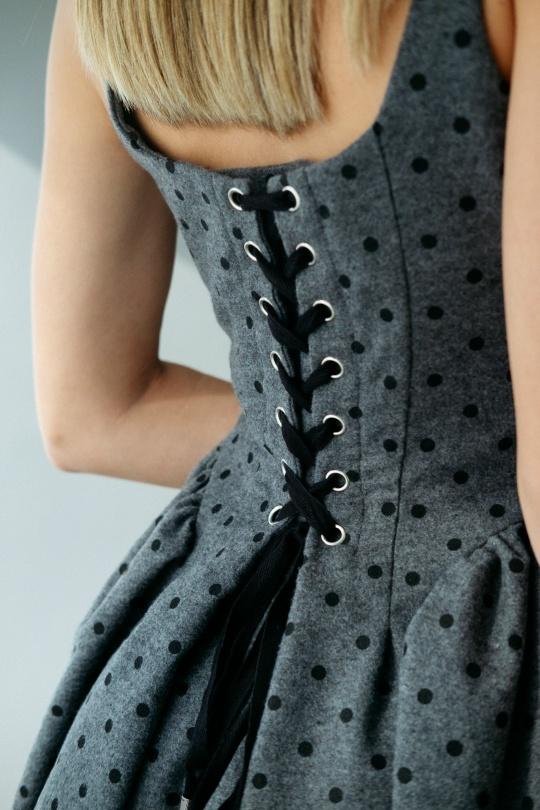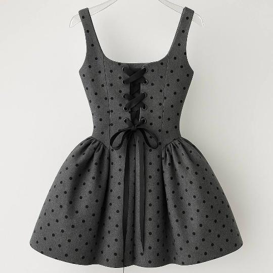 Состав: Хлопок 100 % – Классический хлопок: дышит, впитывает влагу, приятен к телу – Ткань без эластана – нет растяжимости, но отлично держит форму благодаря шнуровке – Подвержено сминанию Фасон: приталенный корсет со шнуровкой (можно регулировать размер), объемная мини‑юбка и квадратный вырез. Принт - горох Уход: деликатная стирка при 30 °, гладить с изнанки